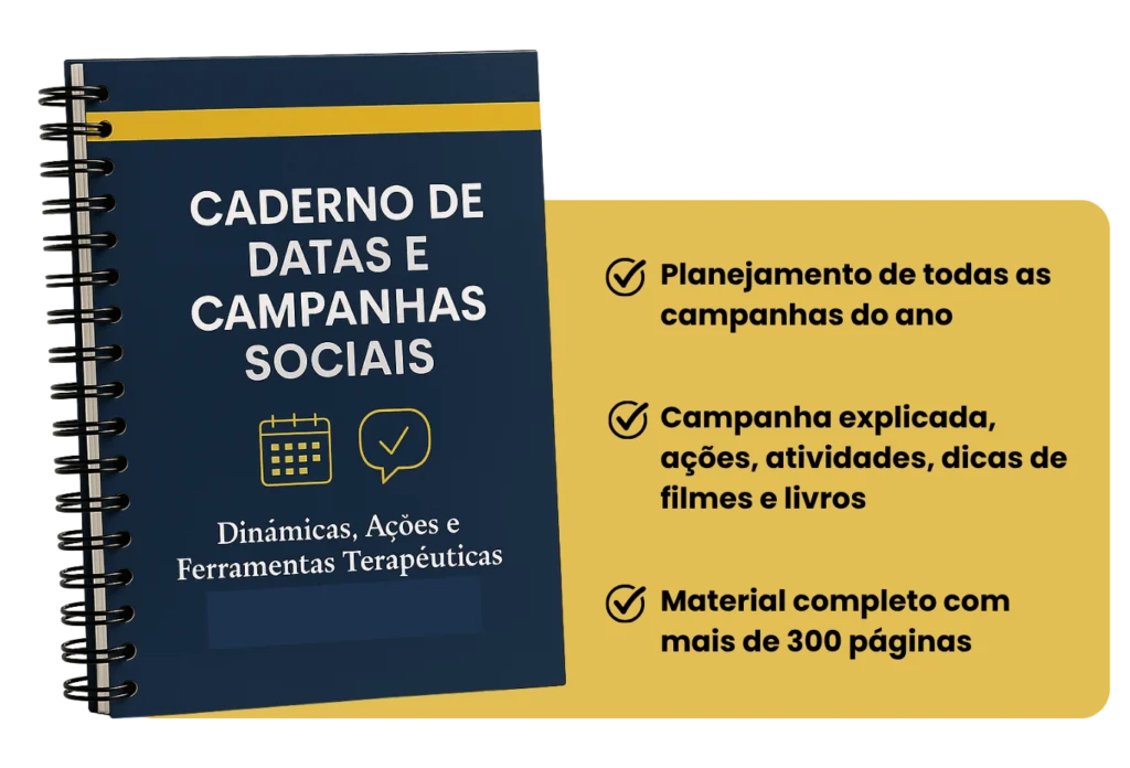 O Caderno de Datas e Campanhas Sociais reúne +30 campanhas completas em mais de 300 páginas com explicações, atividades, dinâmicas e lembrancinhas prontas para aplicar o ano inteiro — tudo organizado e pronto pra facilitar seu trabalho e recebe a atualização para 2026.